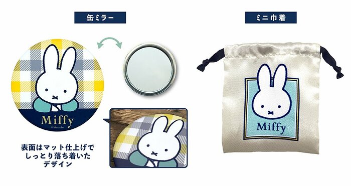 ミッフィーのデザイン面をマットな質感に仕上げた缶ミラーと、紺色のリボンをあしらったサテン生地のミニ巾着の上品なセットです。缶ミラーは普段使いしやすい手のひらサイズ。ミニ巾着は単品でリップやアクセサリーなどの小物入れとしても活用できます。