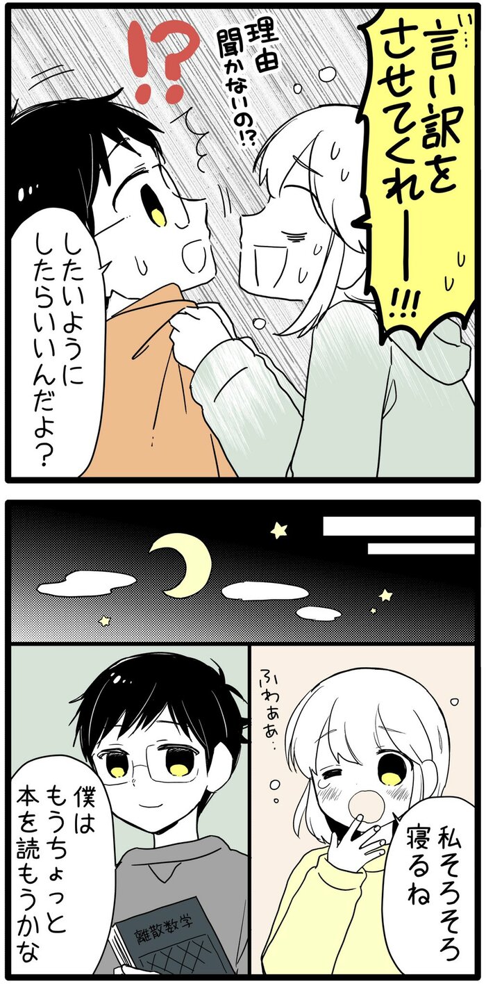 まるで、「今日の晩ごはんはカレーでいい?」と聞いたときと同じぐらいにすんなりと別寝室を受け入れた旦那さん。逆にデス子さんは「言い訳をさせてくれー!!!」「理由聞かないの!?」動揺してしまいますが、旦那さんは当たり前のように「したいようにしたらいいんだよ?」と返答するのでした。