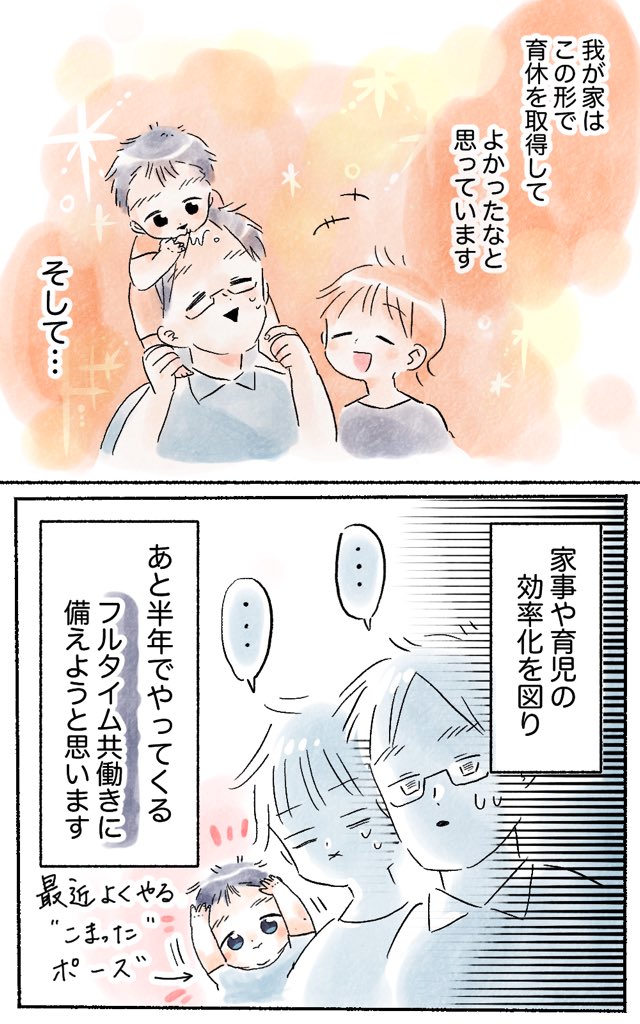 「我が家はこの形で育休を取得してよかったなと思います」と話す一方、心配なのは、旦那さんの育休が終わってから訪れる「フルタイム共働き」。今後さらに家事や育児の効率化を図り、そのときに備えようと決意する子持ちしらごさんなのでした。