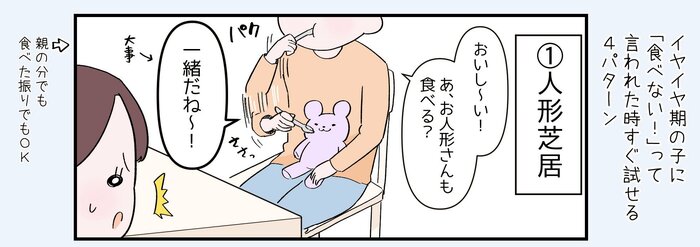 ベビーシッターをしながらブログやSNSで漫画を発表している、さいお なおさん(@saionao_)。ツイッターで「イヤイヤ期で『食べない!』っていわれたときに、その場で試せる方法」4選を公開し、注目を集めていました。