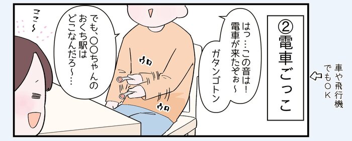 続いては、乗り物大好きな子に効果が高そうな「電車ごっこ」。電車でなくて車や飛行機やでもOKだそうです。乗り物の終着点を「お口」にすることで、そのままスムーズに食べてくれるという方法で、ちなみに筆者にも娘がいるのですが、いつもこれで「宇宙船」をやって食べてもらっていました…。
