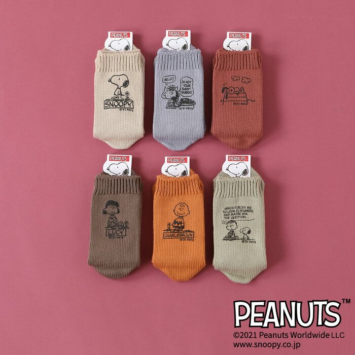 ビンテージのスウェットを思わせるくすみカラーのベースに、人気のPEANUTSの仲間たちをプリントしたソックスです。ライナス、サリー、スヌーピー(赤)はコミックの1コマがプリントされています。ベースの靴下もスウェットのようにラフに楽しめるざっくりとした編地もポイントとなっています。