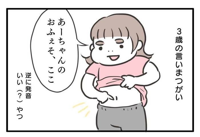 「あーちゃんのおふぇそ、ここ」。いいたかったのは「おへそ」です。まるでフランス語?のような「フェ」の発音が気になります。
