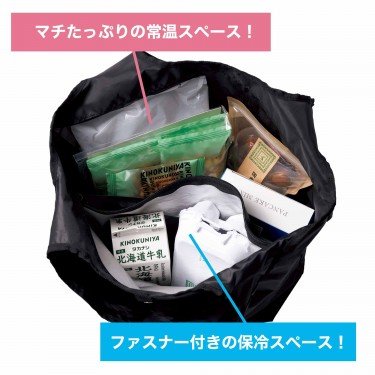 これまでも付録として高い人気を誇ってきたKINOKUNIYAのバッグですが、今回のアイテムは「保冷と常温が仕分けられるマルシェバッグ」なのがポイント。バッグはファスナーが付いた保冷・保温スペースと、常温スペースとに使い分けることができます。温度が気になるものと常温で平気なものを1枚のバッグに収納できるのがうれしいですね。