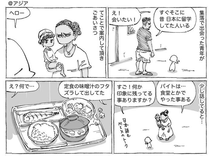 海外で日本のことを少しでも知ってくれている現地の人に会うと、ほっとした気持ちになりますよね?今回の投稿で描かれたのは、日本に留学、アルバイトをしたことがあるという現地の女性とのほっこりする会話の様子です。