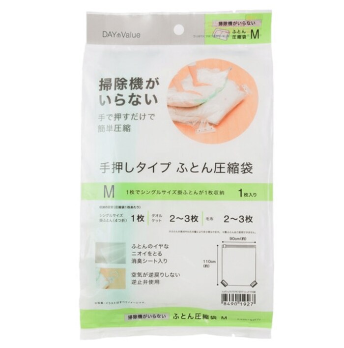 手で押すだけで、簡単に圧縮できる便利な布団収納袋です。幅広逆止弁を使用しており、空気をスムーズに抜くことができます。気になるニオイを取る消臭シート入りで、24時間でアンモニア(体臭など)は約92%、硫化水素(タバコなど)なら約98%消臭することが可能。圧縮保持期間は約6か月、繰り返し使用できます。