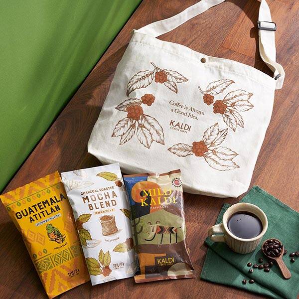 人気NO.1ブレンド「マイルドカルディ」、バッグ限定コーヒー「炭焼モカブレンド」「グアテマラ アティトラン」のコーヒー豆3種とたっぷりサイズのワンショルダートートのセット。