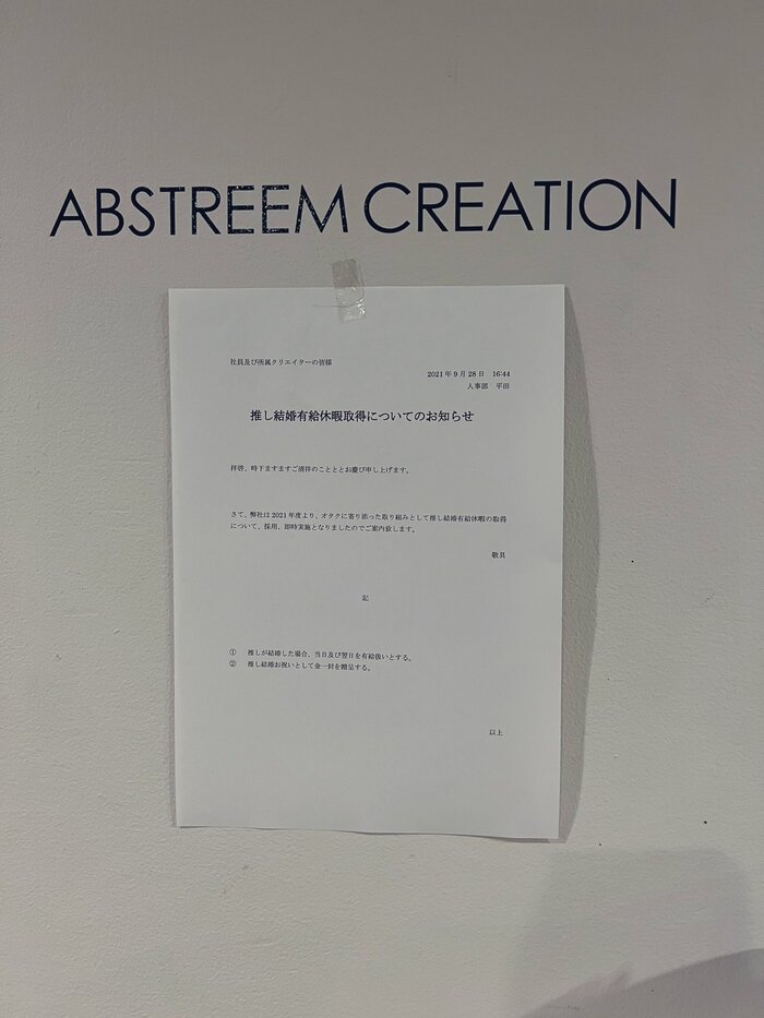 そのタイトルは、なんと「推し結婚有休取得についてのお知らせ」。こちら、いわゆる「推し」(オタクが好きであったり、応援する対象のこと)が結婚してしまった場合に、結婚の当日、及び翌日が「有給休暇」扱いとなること、そして結婚祝いとして金一封がもらえてしまう制度なんだそうです。