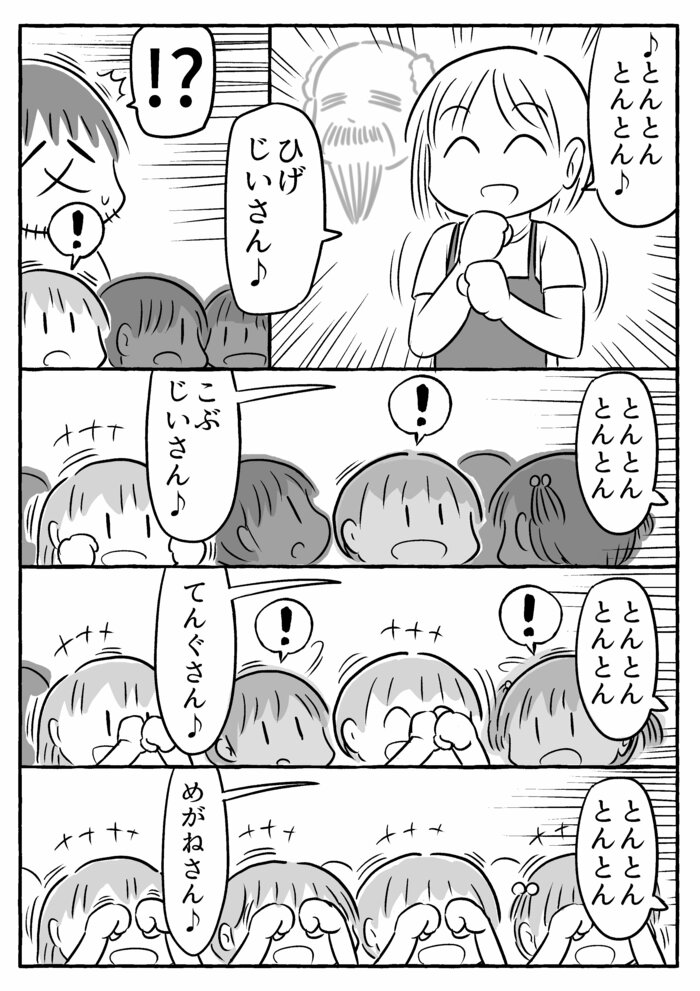 皆さんも、きっと一度は聞いたことがあるであろう、民謡『ひげじいさん』。歌いすすめるごとに子供たちはどんどん保育士さんと合わせて歌い出し…。歌い終わる頃、園児たちはひとり残らず手をお膝に。静かになった園児たちの様子を見て、中村さんは思うのでした。