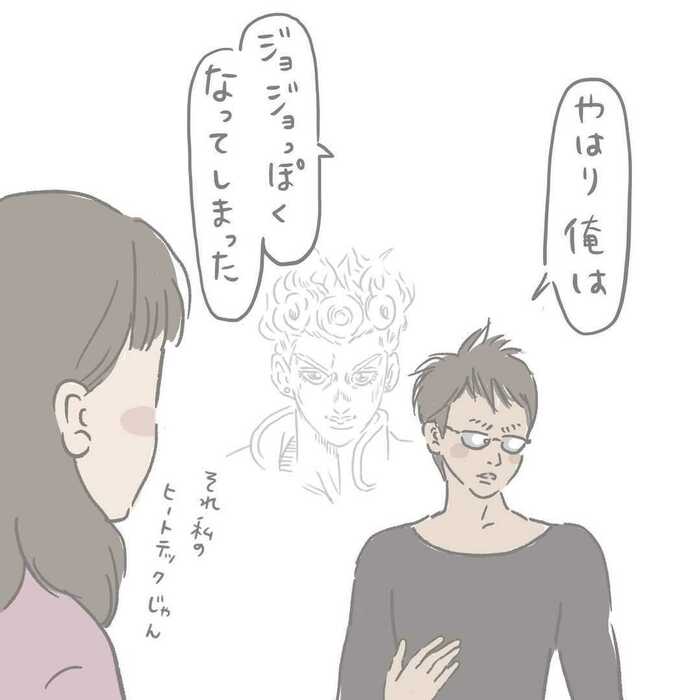 ジョジョといえば、人気漫画『ジョジョの奇妙な冒険』であることは皆さんお分かりですね?ジョジョって、男性キャラでも身体のラインが分かるようなファッショナブルな衣服を着ていることが多いので、小さなヒートテックを着た旦那さん、確かにジョジョっぽさが漂っています。後ろには主人公の一人であるジョルノ・ジョバァーナまで出てきちゃってますね…。