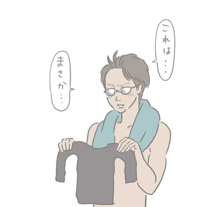 お風呂上がり、いでさんのヒートテックを見つめながら、「これは…まさか…」と何か思いついた様子の旦那さん。小さいピチピチのヒートテックを着てみたかったようなのですが…?