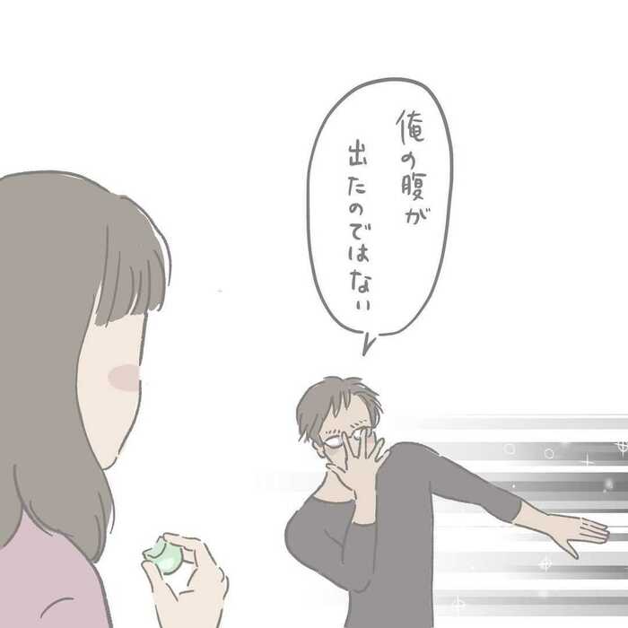 「俺の腹が出たのではない。この辺りの時空が歪んでいる」。ちょっと何いってるのか分かりませんが…あくまで世界観を大切にする旦那さんなのでした。