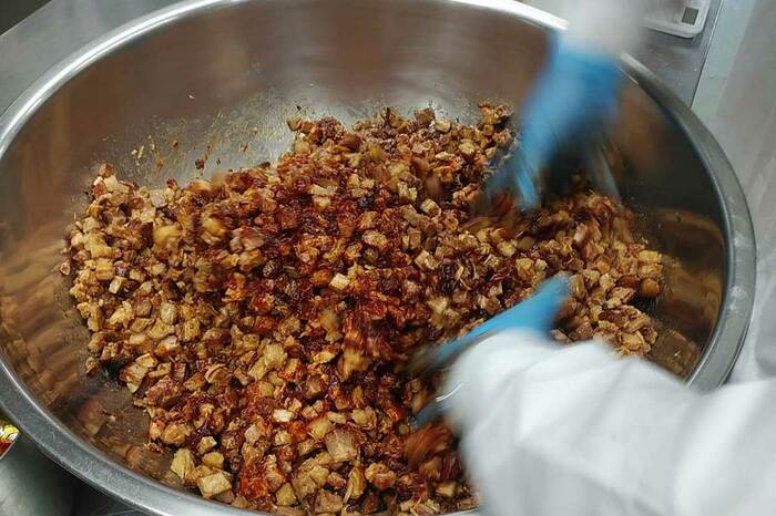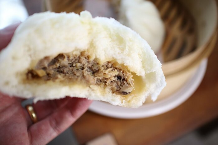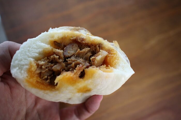 割いてみたところ、中には大きな角切り豚肉がゴロゴロです。一口食べると、まず感じられるのが高級な中華料理屋さんで食べる、いわゆるチャーシューライクでスパイシーな香り。これがいわゆる五香粉(ウーシャンフェン)ですね。一般的な肉まんだとひき肉を使うイメージがありますが、この肉感は食べごたえありますね…。