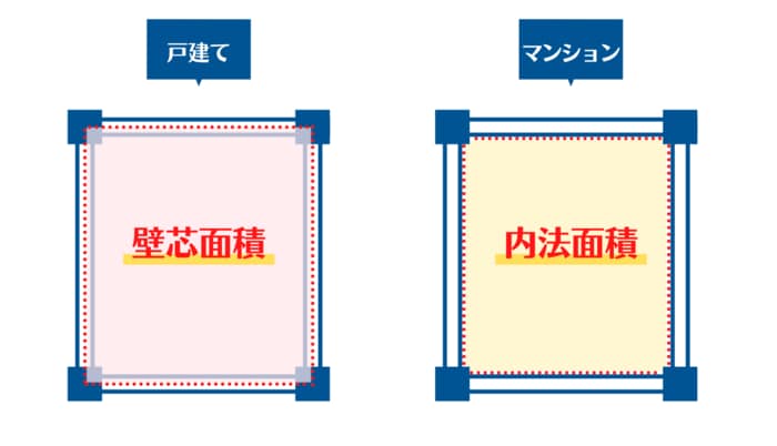 ここで気を付けていただきたいのが、床面積の測り方。戸建て住宅は、壁の中心線を想定して計測する「壁芯面積」が床面積となりますが、マンションは壁の内側の線を基準として計測する「内法面積」が床面積となります。