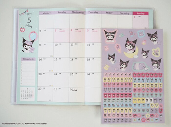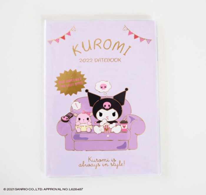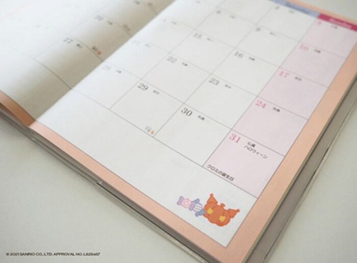 表紙は、バコと映画鑑賞(!?)しながら、おうち時間を楽しんでいるクロミをデザイン。全体的に淡いパープルがほどこされたダイアリーに、ふんだんに使われたゴールドの箔押しがオシャレです。中身は、1日の記入欄が大きい仕様で、カレンダー以外にもTO DOリストや六曜、月齢も記載されています。また、切り離して使えるメモ用紙やスケジュールシールもついているので、楽しく予定の管理が出来ますね。カレンダーには10月31日のクロミの誕生日もしっかり予定に書かれているので、クロミ推しの方は特にうれしいのでは。