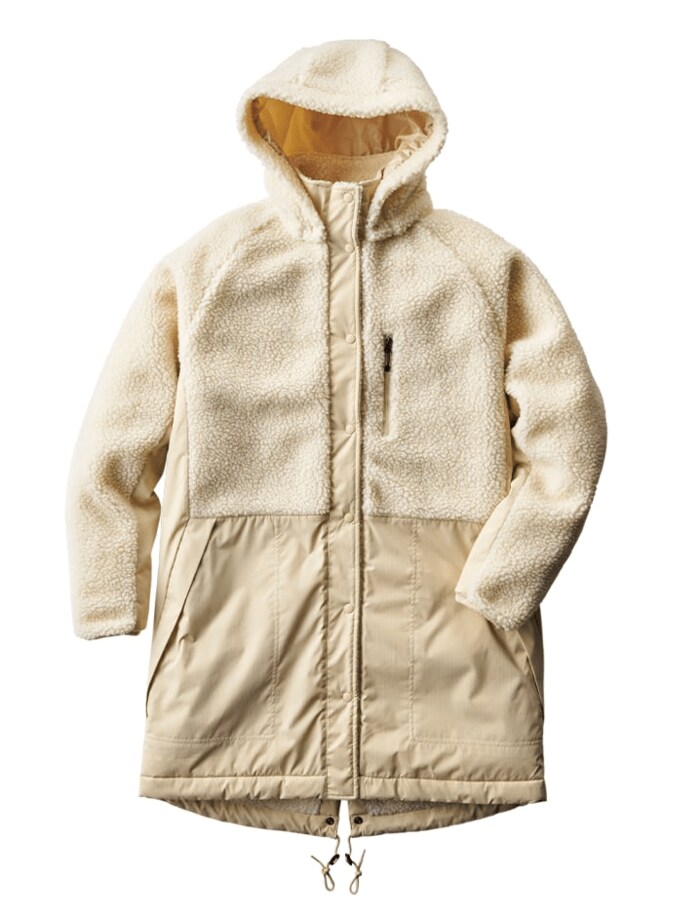 なんとボア素材なのに水をはじくという、汚れに強いボアコートです。2021年モデルはフードの着脱が可能になり、きれいめコーデにも合わせやすくなりました。裾にはドローコードがついているため、キュッと絞れば風の侵入を防げます。