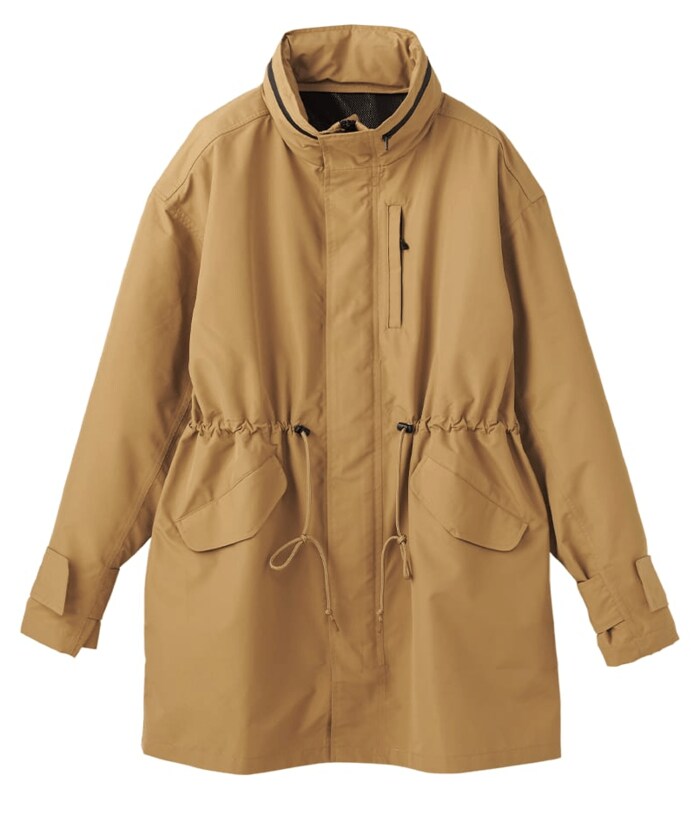 耐久撥水機能付きで、急な雨にも対応できる軽量アウター。腰のアジャスターでシルエットを変えれば、通勤コーデにもぴったりなきちんと感が生まれます。フードは折り畳み可能で、さまざまなテイストに合わせやすいのが特徴です。