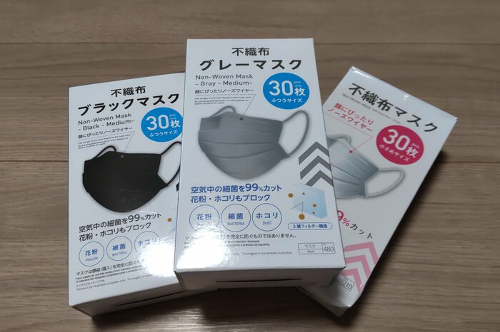 その後、マスク不足が解消されつつある現在、ダイソーでは再び「30枚入り税込110円の不織布マスク」を目にするように。見慣れたホワイト・ブラックタイプに加え、最近ではグレータイプの不織布マスクが登場し、購入できるようになりました。