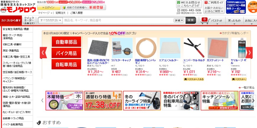 MonotaRO(以下、モノタロウ)は、事業主向けショップMonotaRO.com及び一般般消費者向けショップIHC.MonotaROを運営している通信販売会社です。東証1部ではMonotaRO(3064)として上場しています。