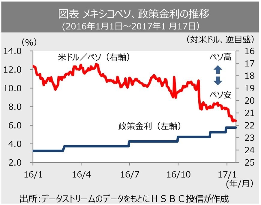 昨年11月の米国大統領選挙以降、トランプ新政権の政策、とりわけ通商政策(北米自由貿易協定(NAFTA)見直し等)及び移民政策を巡る不透明感から、メキシコへの影響について懸念が広がっています。加えて、トランプ新政権の積極的な財政政策が米国でインフレ圧力を高め、金利が上昇する可能性も、多くの投資家は警戒しています。