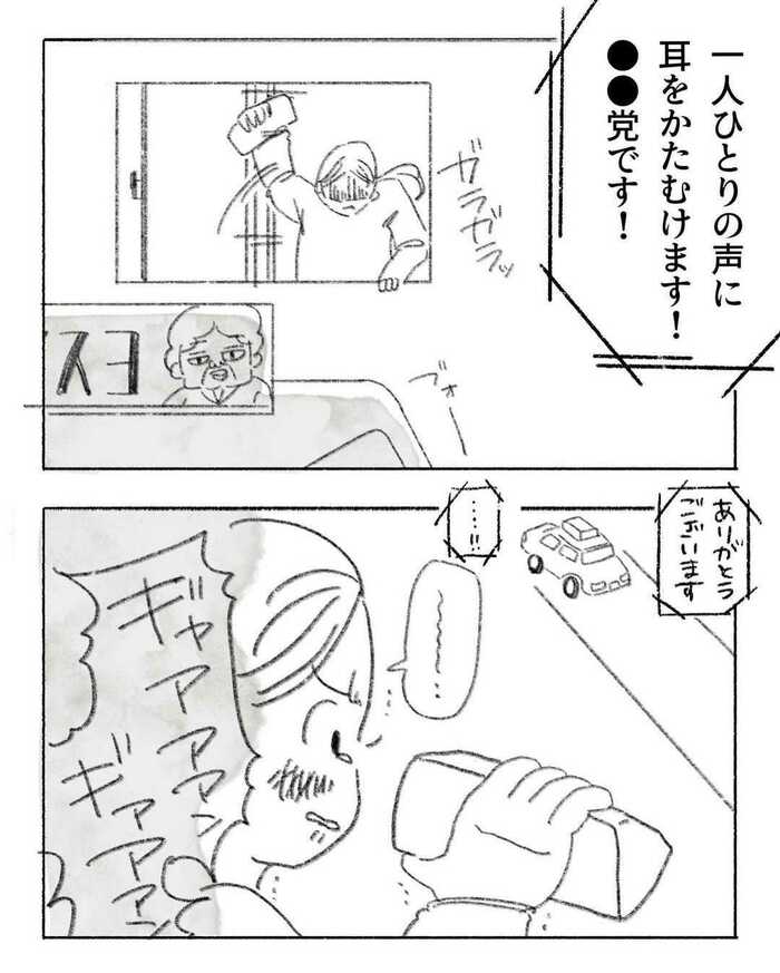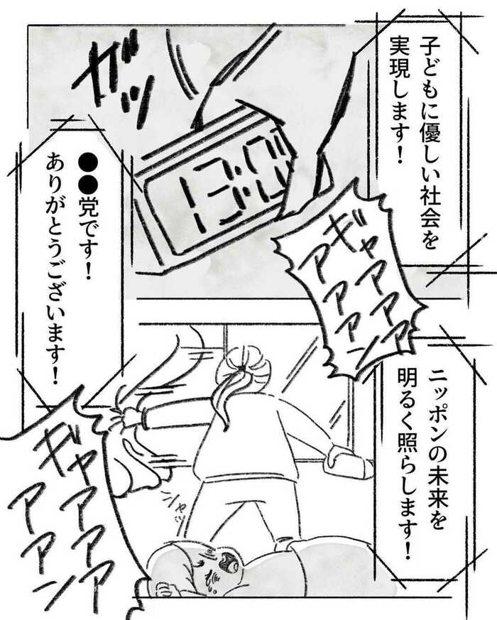 怒りのあまり、置き時計を掴んで選挙カーに向かって振り上げますが…?「大丈夫、大丈夫」。やり場のない悲しみに、目からは涙が…。再び寝かしつけをはじめるやまぎしさんなのでした。