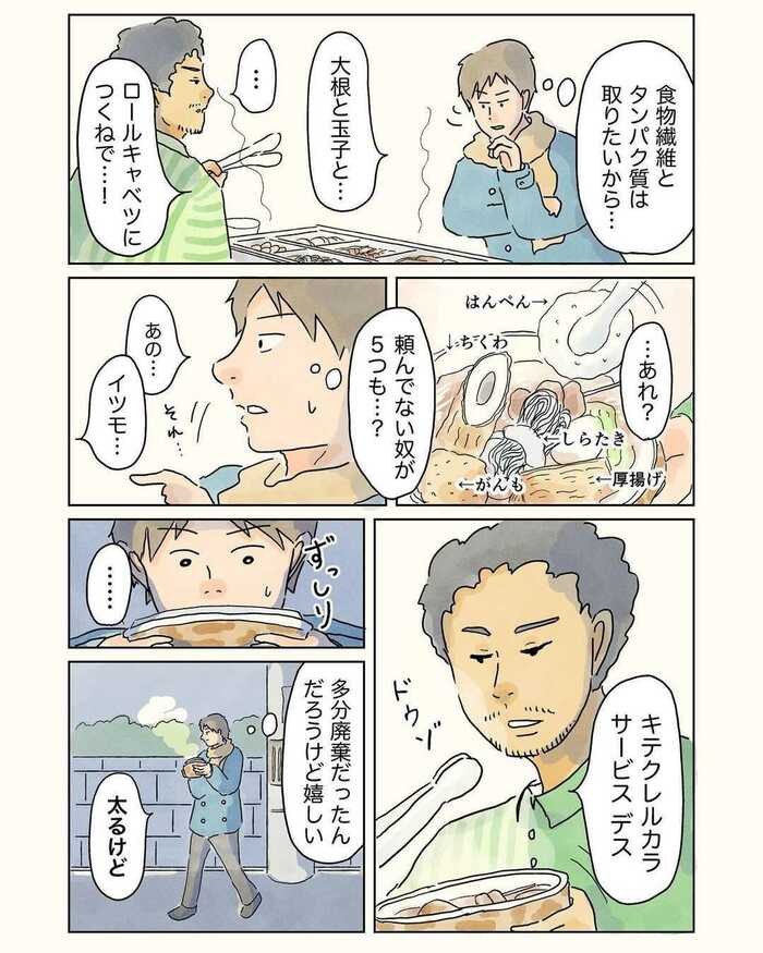 お店では販売データなど取っているはずですから、もしかしたら賞味期限ぎりぎりのおでん?だったのかもしれませんね。それでもその心遣いに、「嬉しい」「太るけど」とほっこりするコンテさんなのでした。