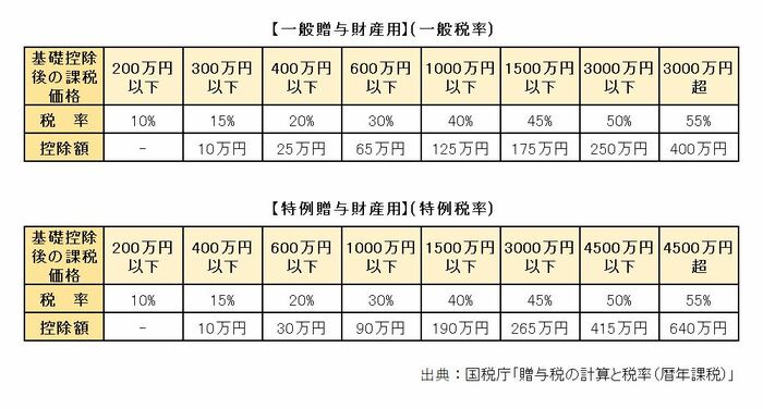 贈与税の税率は、「一般贈与財産」と「特例贈与財産」に区分されています。「特例贈与財産」は直系尊属(祖父母や父母など)から、その年の1月1日において20歳以上の者(子・孫など)への贈与税の計算に使用し、「一般贈与財産」はそれ以外の場合の贈与税の計算に使用します。