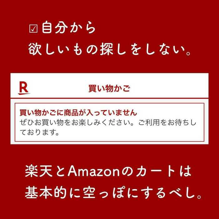 これもあるあるかもしれません。自宅にいて暇なとき、ついつい楽天やAmazonをダラダラ見ちゃいません?「あ、これほしいかも」と悩んだら、とりあえずショッピングカートに入れて様子見。たしかにこれではいつまでたっても節約できませんね。