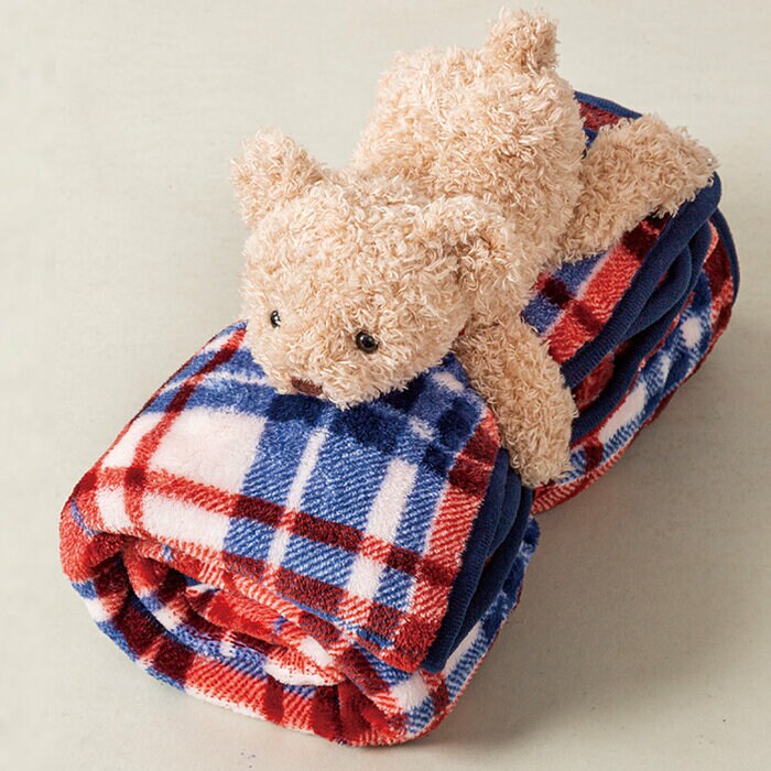 あたたかみのあるチェック柄のブランケットをベアフルと一緒に。ブランケットはベアフルできゅっと束ねることができます。ご自宅やオフィスでの寒さ対策や、アウトドアでもご使用いただけます。
