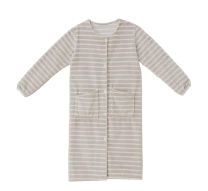 定番のあたたかさの着る毛布です。首元すっきりラウンドネックなので、フードなどが苦手な方でも心地よく着用できます。かわいいボーダーデザインで、カラーはネイビーとグレーの2色を展開。ミドル丈なので、動きやすいのも特徴です。男女兼用タイプで、保湿・制菌防臭仕様です。また、一体型となった収納袋付きなので使用しない時は小さくたたんでしまっておくことができます。