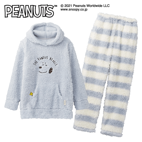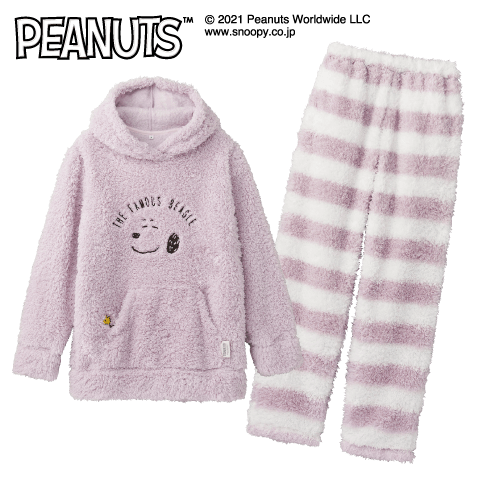 スヌーピーはピンクとライトブルーの2色を展開。ボーダーのパンツと、ポケットから顔を出すウッドストックがかわいいトップスはフード付き。かわいい上下セットです。