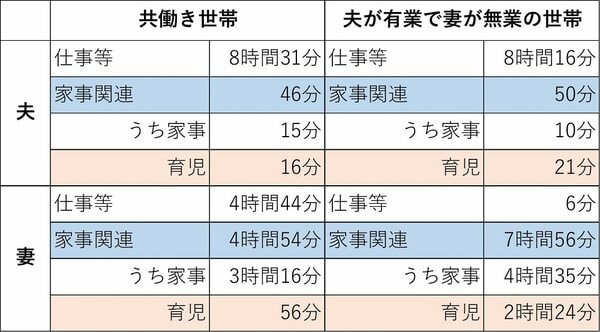 総務省が5年ごとに実施する「社会生活基本調査」の平成28年度の生活時間に関する結果を見ると、6歳未満の子供がいる共働き世帯の妻は、4時間以上の仕事をこなしながら家事や育児のほとんどを担っているということがわかります(図表1参照)。