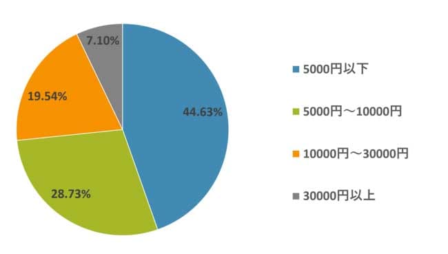 服の単価についても聞いてみたところ、「5000円以下」と答えた人が圧倒的に多く、44.63%。「5000円~10000円」が28.73%、「10000円~30000円」が19.54%、「30000円以上」が7.10%という結果でした。