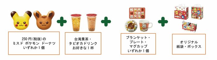 ・セット内容:ポケモン ドーナツ×1、台湾果茶もしくはタピオカドリンク×1、グッズ×1(クリスマスセット専用のオリジナルボックス、もしくは紙袋付き)ショップにより取扱品目が異なります)