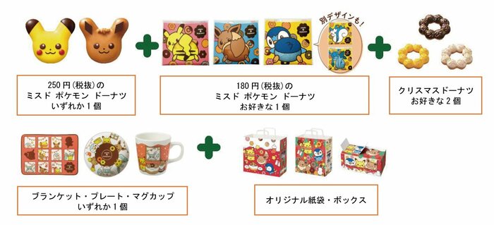 ・セット内容:ポケモン ドーナツ×1、ふりむきドーナツ×1、クリスマスドーナツ×2、グッズ×1(クリスマスセット専用オリジナルボックス、もしくは紙袋付)