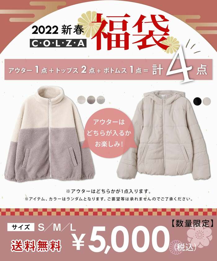 ブランド名が書かれたオリジナルバッグの中に、アウター1点とトップスが2点、ボトムス1点が入った計4点の福袋です。アウターは2種類あり、どちらかがランダムに入っています。サイズはMサイズとLサイズの2種類で、価格は税込5000円です。送料無料となっています。