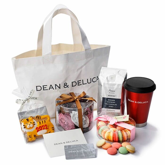 ・セット内容:DEAN & DELUCA HOUSE BLEND 粉 227g、DEAN & DELUCA サーモタンブラー ラズベリーレッド、DEAN & DELUCAデコレーションクッキー 干支(寅)、DESSERT INNOVATION Les Patiences Cocktail aux saveurs fruiteés、Rippa バーチディダマ アーモンド×カカオ 8pcs、DEAN & DELUCAギフトカード(1000円分)、DEAN & DELUCAペーパーバッグ
