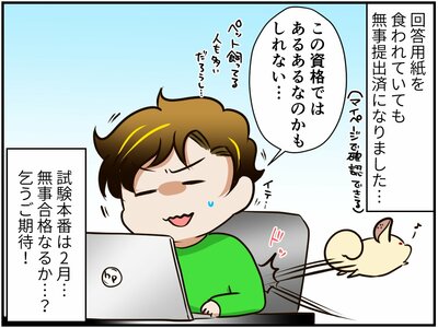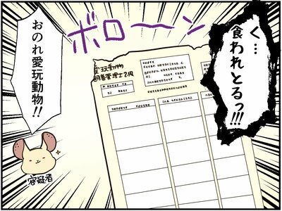 しかし、ネズミさんたちの面倒を見ながらの勉強はなかなか大変。受講に必要なテキストは福くんに無残にかじられ、オンライン受講中は、部屋んぽ中のあみだちゃんがデスクの周りをウロウロチョロチョロ…。