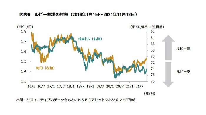 インドルピーは2021年9月以降、米ドル高・円安が進行する中で、対米ドルでは下落、対円では上昇している(11月12日現在)。