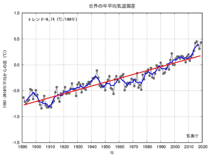世界の平均気温は1880~2012年の過去42年間で0.85度上昇しました。この気温上昇の半分以上は人間の活動による温室効果ガス濃度の増加等が原因とされています。