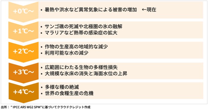 この気温上昇が具体的にどのような影響を与えるか、世界の平均気温の上昇幅に応じて見ていきましょう。