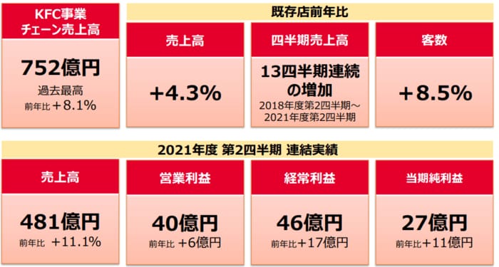 コロナ禍の中でも店舗業績が堅調に推移した「ケンタッキーフライドチキン」は、緊急事態宣言明けも堅調な業績を維持しています。