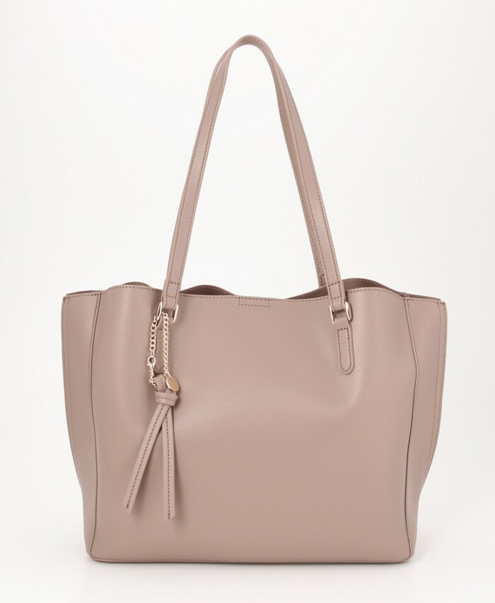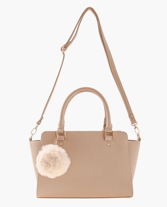 ショルダー部分を外しても使用できる、高見えハンドバッグ。ゴールドの金具やレザー調の素材が、上品な装いにぴったりです。ふわふわとしたファーのチャームがアクセントになっています。