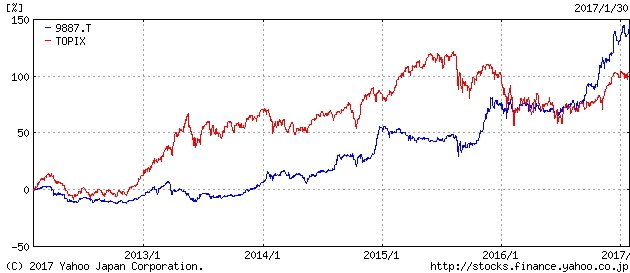 同社の株価は基本的に上昇基調にありますが、2015年半ばまではTOPIXの上昇率には追いつけませんでした。しかし、2015年夏以降にTOPIXが調整を始める局面で、同社の株は上昇し、2016年の年初から年央まで両社のパフォーマンスが並びました。