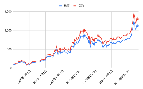 同社の株価は2021年に入るといったん調整したものの、5月以降反転し、じりじりと値を上げ、2021年10月以降には再度大きく上昇に転じました。