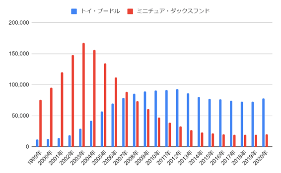 そして、2008年にトイ・プードルはミニチュア・ダックスフンドの登録頭数を抜くことになります。