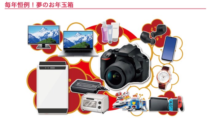 ・夢のお年玉箱2022 SIMフリースマホ OPPOの夢(10000円(税込))、夢のお年玉箱2022 SIMフリースマホ Xiaomiの夢(20000円(税込))、夢のお年玉箱2022 SIMフリースマホ モトローラの夢(8000円税込)、夢のお年玉箱2022 ニンテンドースイッチ(有機EL)の夢(45000円(税込))、夢のお年玉箱2022 ニンテンドースイッチの夢(35000円(税込))、夢のお年玉箱2022 ガンプラの夢(15000円(税込))、夢のお年玉箱2022 トミカプラレールの夢(5000円(税込))、夢のお年玉箱2022 サウンドバーの夢(30000円(税込))、夢のお年玉箱2022 ノイズキャンセルイヤホンの夢(12000円(税込))、夢のお年玉箱2022 フルワイヤレスイヤホン&ワイヤレススピーカーの夢(10000円(税込))、夢のお年玉箱2022 フルワイヤレスイヤホンの夢(7000円(税込))、夢のお年玉箱2022 Bluetoothイヤホンの夢(5000円(税込))、夢のお年玉箱2022 ブルーレイレコーダー(ダブルチューナー・500GB)の夢(25000円(税込))、夢のお年玉箱2022 ブルーレイレコーダー(ダブルチューナー・2TB)の夢(40000円(税込))、他