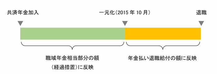2015年10月前に共済年金に加入していた期間が1年以上あり、2015年10月以後に年金の受給権を取得する人は、加入期間に基づいた経過的職域加算および年金払い退職給付が厚生年金に上乗せされて支給されます。
