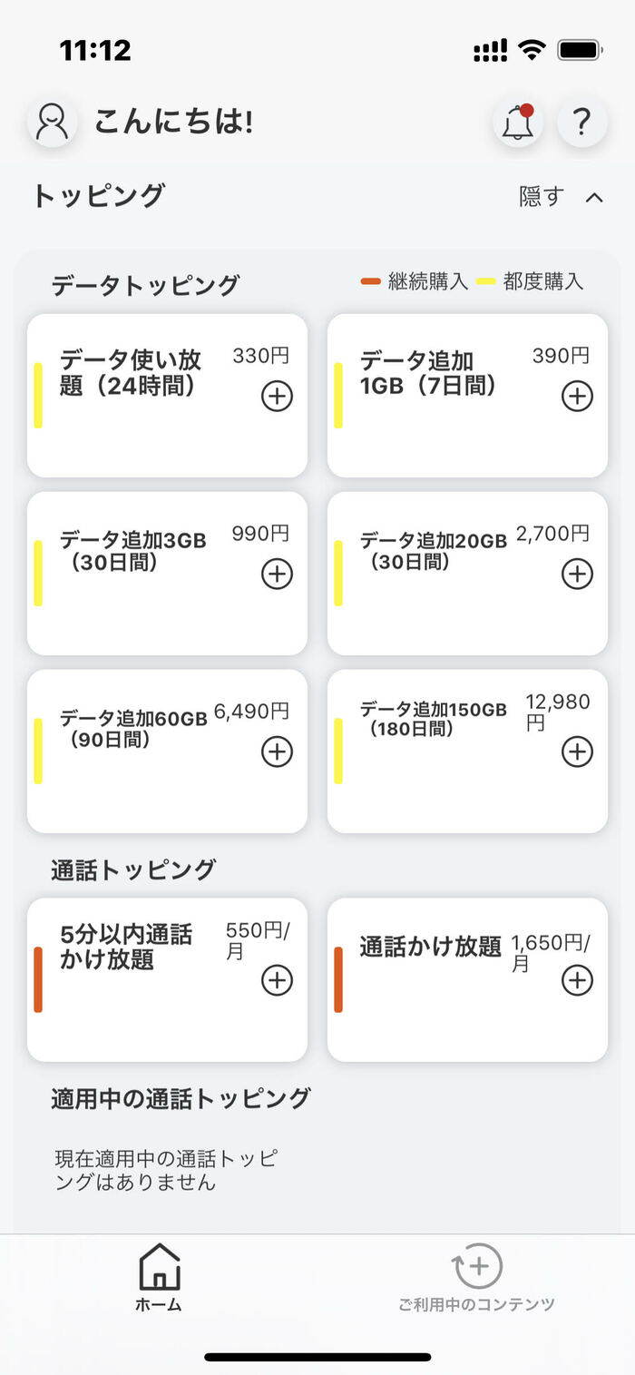 また、それだけではなく、サブ回線として、2台目の端末やデュアルSIMで活用がしやすくなっています。サブ回線としてオススメの理由としては、高速通信を利用したいときに、必要な機能は別途自分で契約する「トッピング」をすることで高速通信にすぐに切り替えることができるからです。トッピングの種類も多く、データ容量、期間によって選択が可能です。通信は5Gに対応しています。