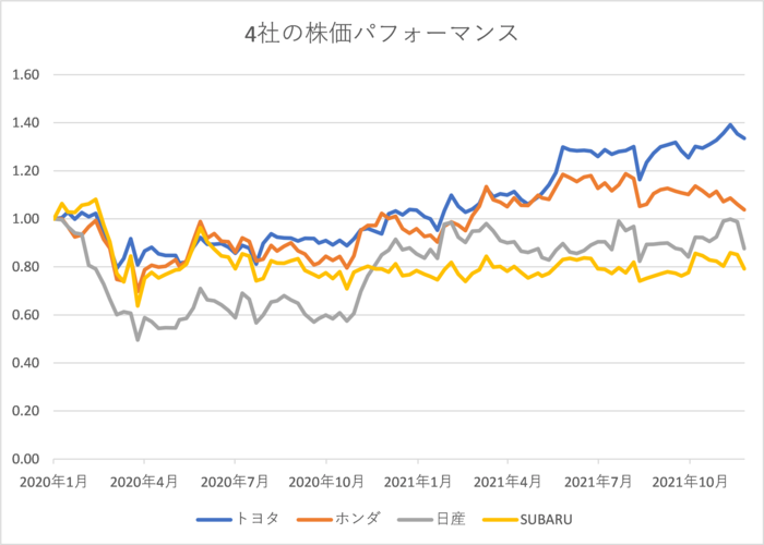 株式投資をしている人であれば、「同じ業種は同じような株価の値動きを見せる」という印象を持っているかと思いますが、こうしてグラフを見てみると、明暗が分かれていますね。2020年の3月下旬に期間中の最安値をつけていたのは4社共通です。しかしその後、トヨタやホンダは好調な持ち直しを見せてコロナ禍以前の株価を上回るパフォーマンスを見せている一方、日産やSUBARUは持ち直しの動きが鈍いです。